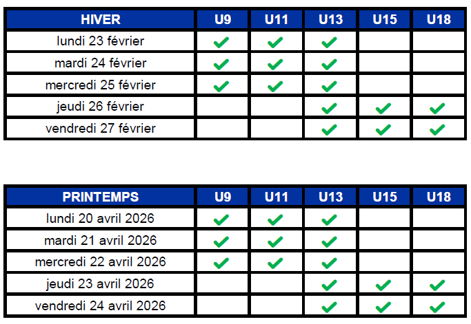 - U9 / U11 / U13 le Lundi 23, Mardi 24 et Mercredi 25 Février