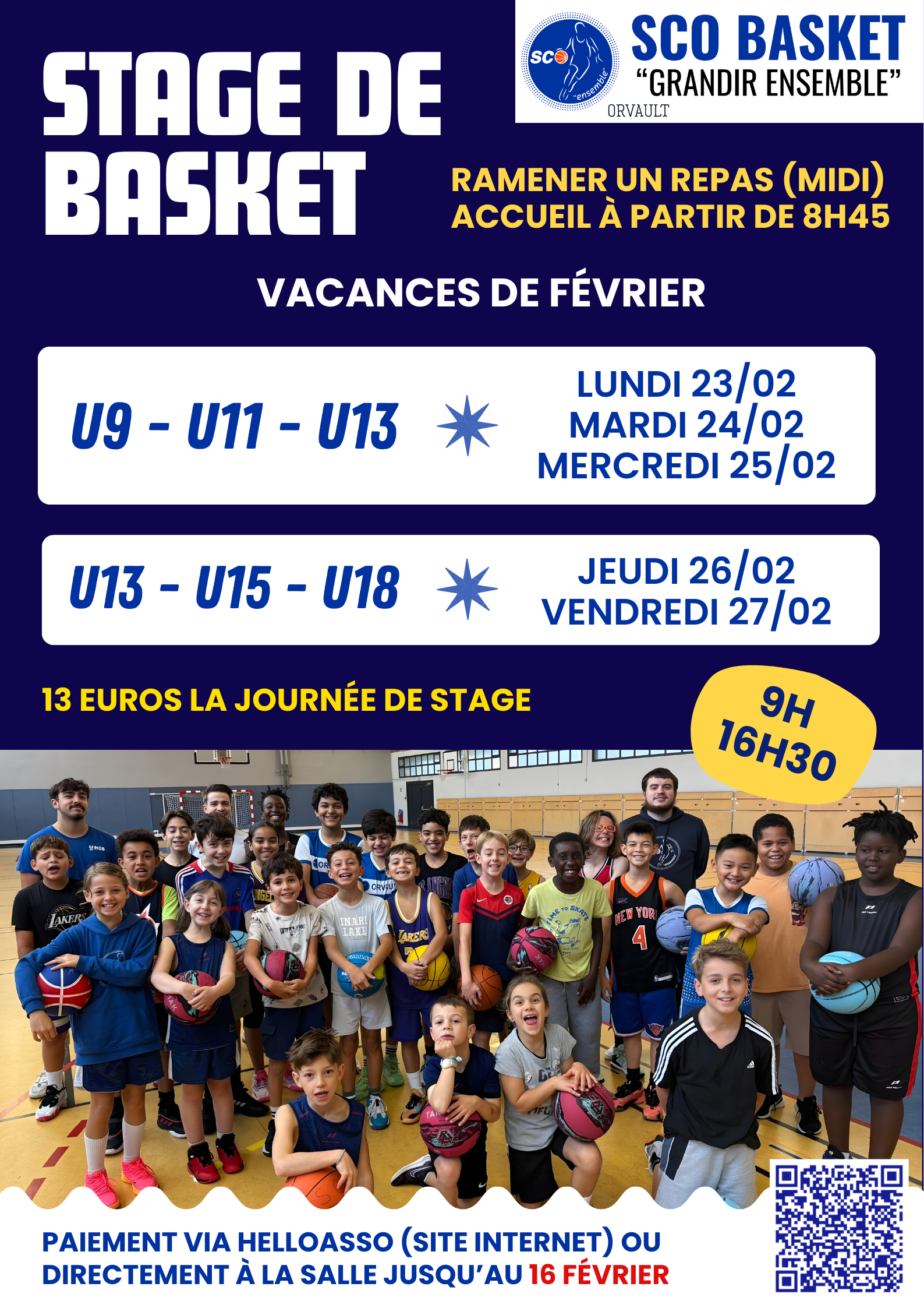 https://www.helloasso.com/associations/sporting-club-orvault-basket/evenements/stage-de-basket-fevrier-2025 - Avec un dossier papier + chèque à déposer au bureau du club, sous enveloppe précisant : la mention “stage” + le(s) nom(s) des enfant(s) + catégorie