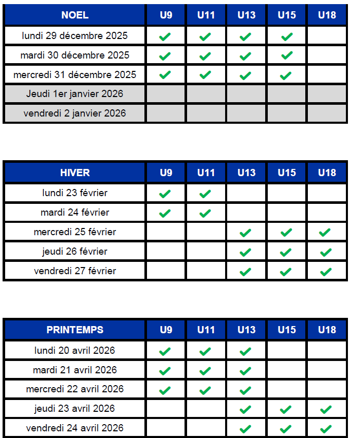 - U13 / U15 / U18 le Mercredi 25, Jeudi 26 et Vendredi 27 Février